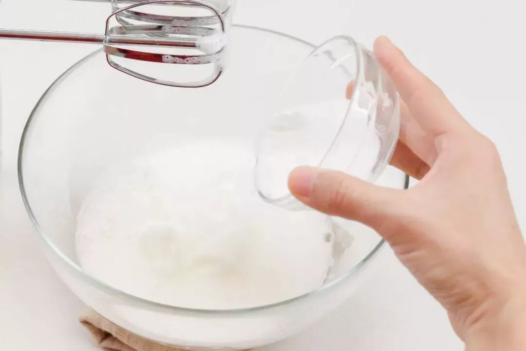 5、电动打蛋器高速打发蛋白过程中,分三次加入40g细砂糖。
