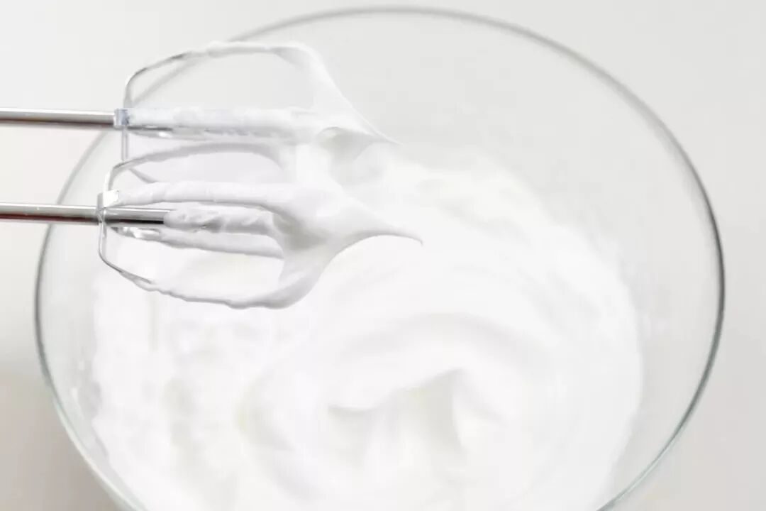 6、接近硬性前转低速,多次观察避免打发过度。直到蛋白霜硬性发泡,可以拉出短而坚挺的尖角。
