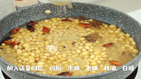 4. 往锅中倒入没过黄豆的清水,再加入适量的盐、鸡粉、生抽、老抽、白糖和蚝油翻炒均匀,盖上锅盖大火烧开后转中小火焖40分钟左右