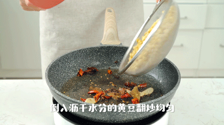 3. 热锅倒油,放入八角、香叶、桂皮、干辣椒,花椒和姜片煸香,再倒入沥干水分的黄豆翻炒均匀