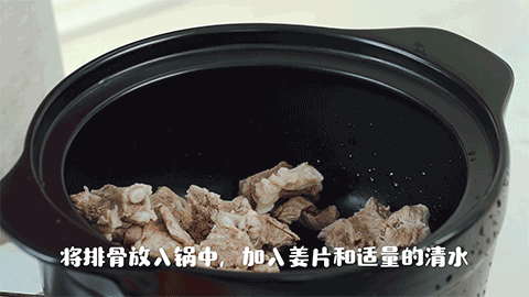 3. 将排骨放入砂锅中,加入姜片和适量的清水,盖上锅盖大火烧开后转小火炖1.5小时左右