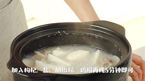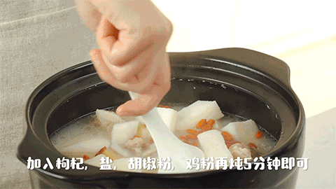 5. 加入枸杞、盐、胡椒粉、鸡粉搅匀,再炖5分钟即可