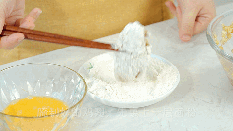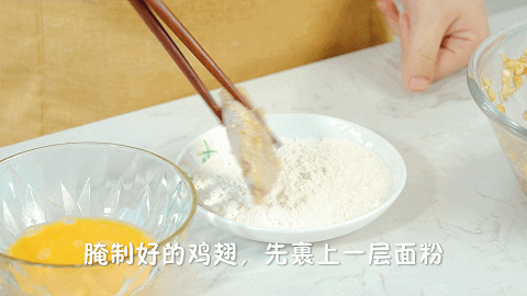 4、取出腌制好的鸡翅,先裹上一层面粉