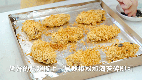 出炉后的鸡翅色泽金黄的,搭配海苔的点缀,看上去非常诱人。