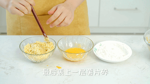 5、然后再裹上一层鸡蛋液,最后再裹上一层薯片碎