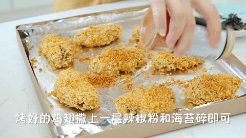7、最后在烤好后的鸡翅撒上一层辣椒粉和海苔碎即可