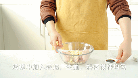 2、加入2勺料酒、适量的蒜泥和生抽,混合均匀后盖上保鲜膜,冷藏一晚上