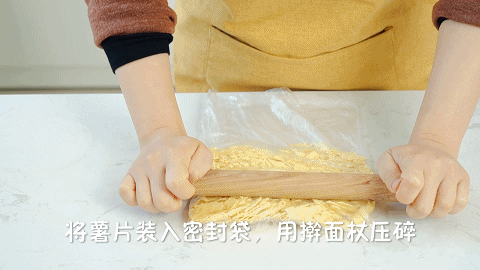 3、将300克薯片装入密封袋,用擀面杖压碎