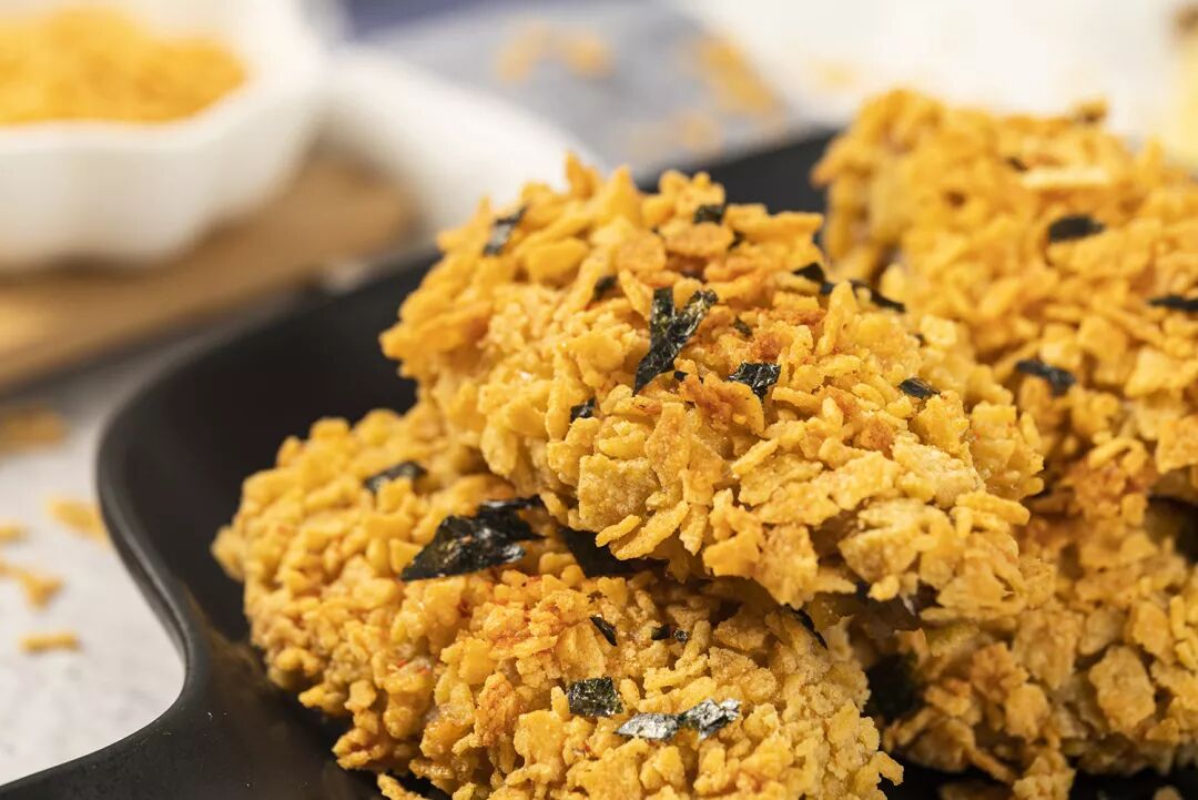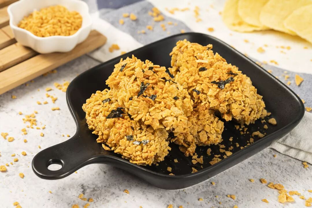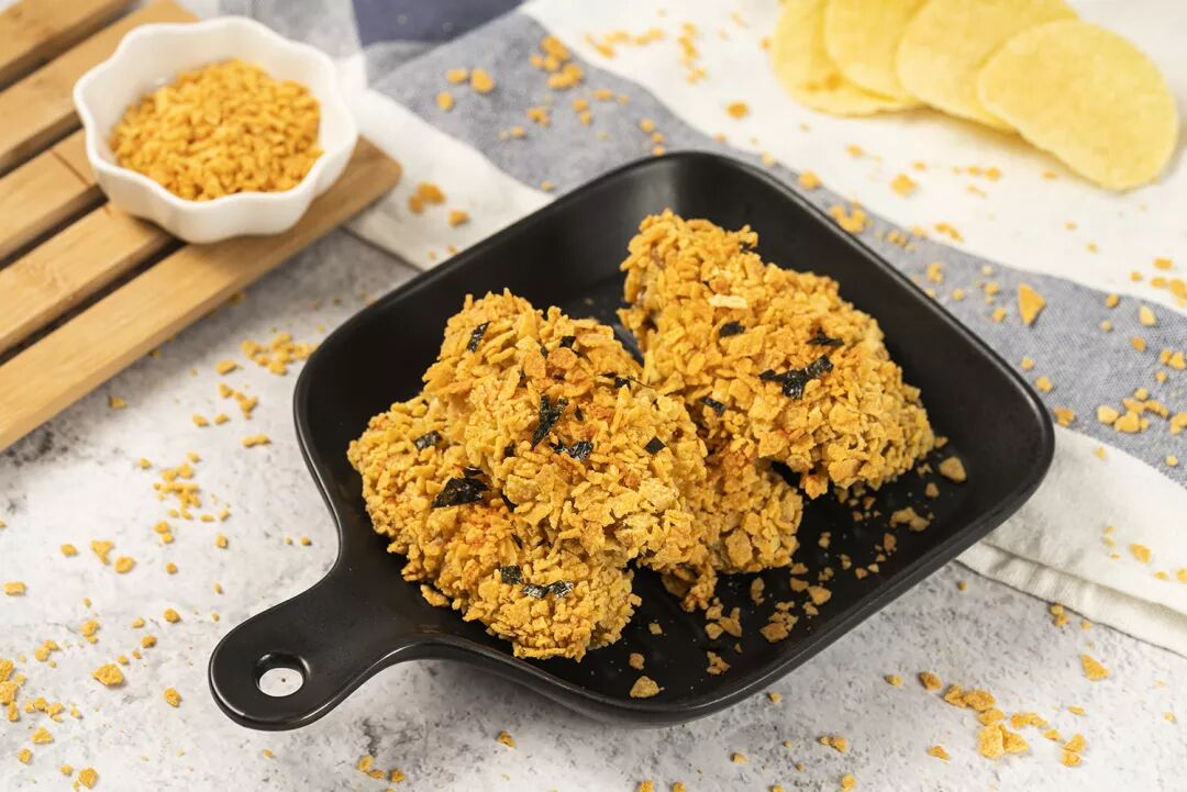 金黄酥脆的薯片包裹香滑多汁的鸡肉,瞬间勾起胃底深层的饥饿!