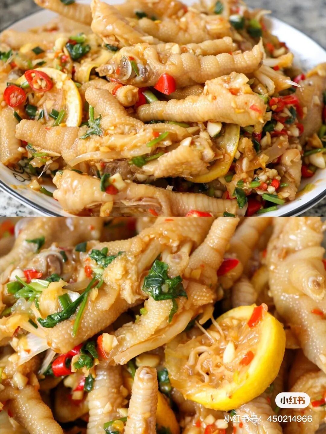 鸡爪1斤、柠檬1个、姜1小节、小米椒7个、蒜头6瓣、香葱1颗、香菜1颗、蒜蓉辣椒酱1勺、料酒2勺、生抽4勺、香油1勺、盐1小勺、糖1小勺、耗油1勺。
