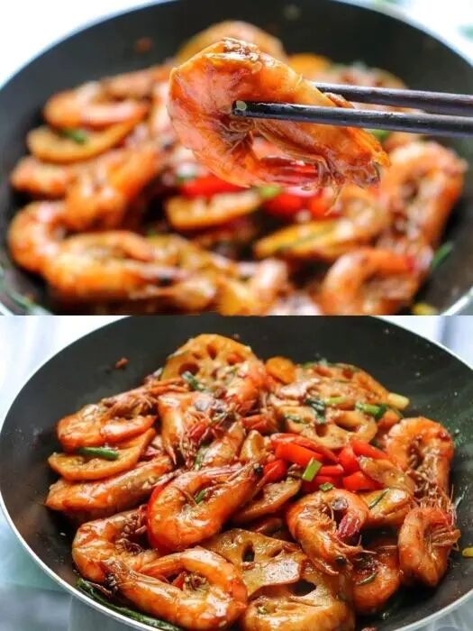 虾400g、姜葱蒜适量、莲藕一截、豆瓣酱1羹、生抽2羹、糖半羹。