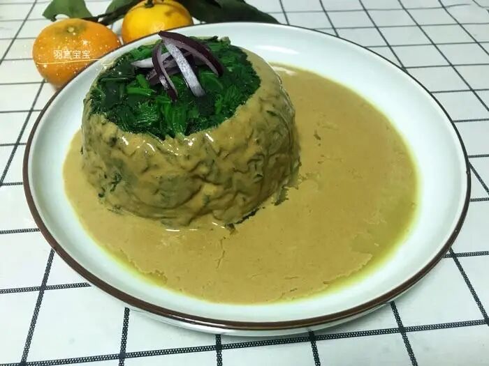 5.将菠菜倒扣在盘子里面,压得紧实的菠菜倒出来就是完全定型的。最后淋上芝麻酱就完成了~