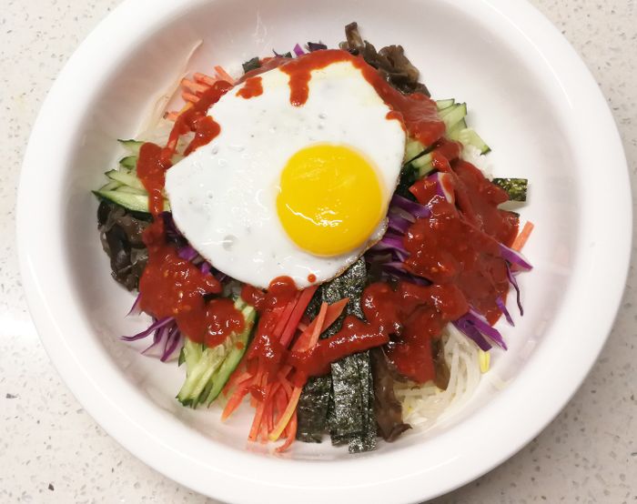 韩式辣酱3勺、自制雪梨汁3勺、各种新鲜蔬菜若干(一般用豆芽,黄瓜,胡萝卜,黑木耳,紫甘兰…)、即食紫菜1片、鸡蛋1个。