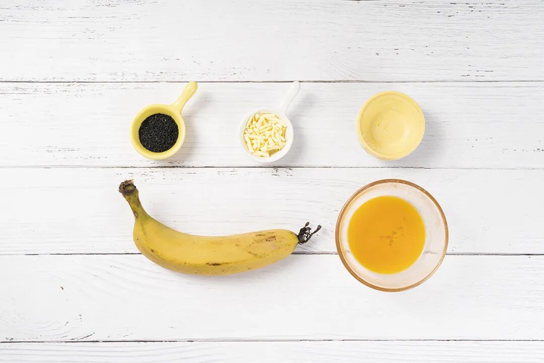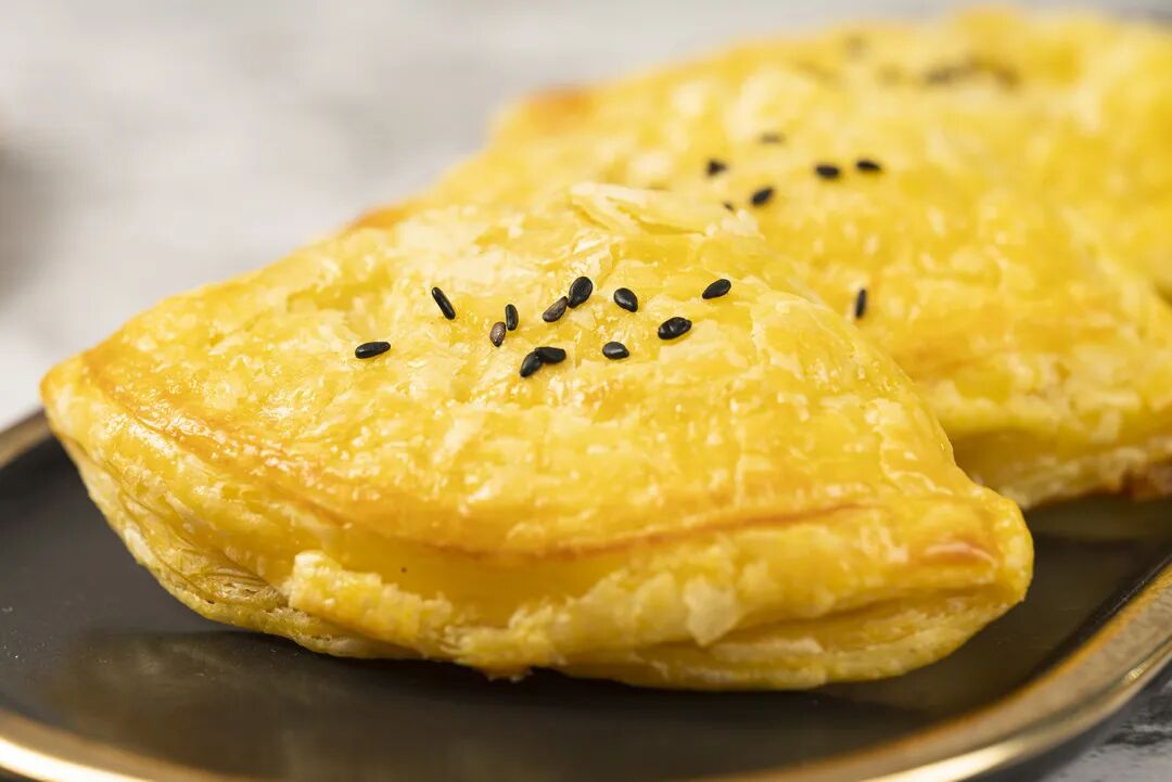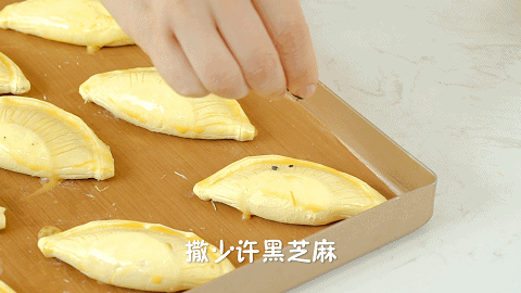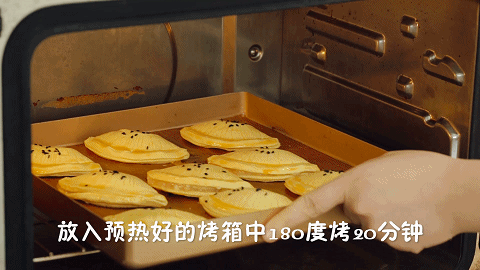 做法简单只有几步,用一句话概括就是:往蛋挞皮内放入香蕉泥和芝士碎,表面撒一层黑芝麻,对半折起拿去烤。
