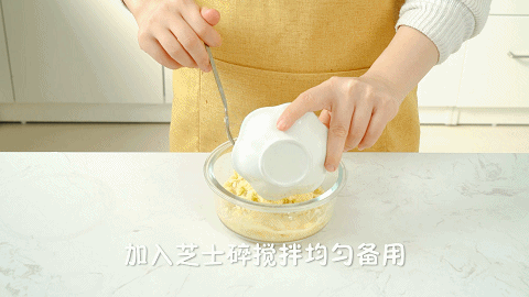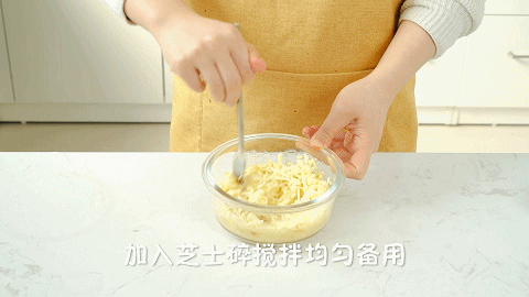 2、往压好的香蕉泥中,加入50克芝士碎搅拌均匀,香蕉芝士馅就做就好了