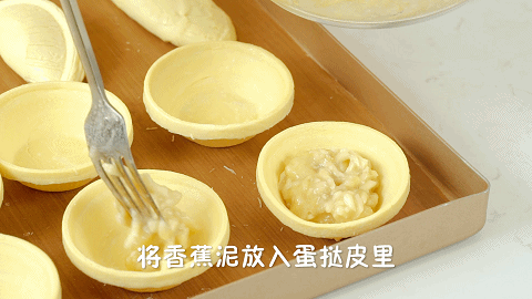 3、蛋挞皮微微解冻后撕去外层锡纸,每个蛋挞皮里放入一勺香蕉芝士馅