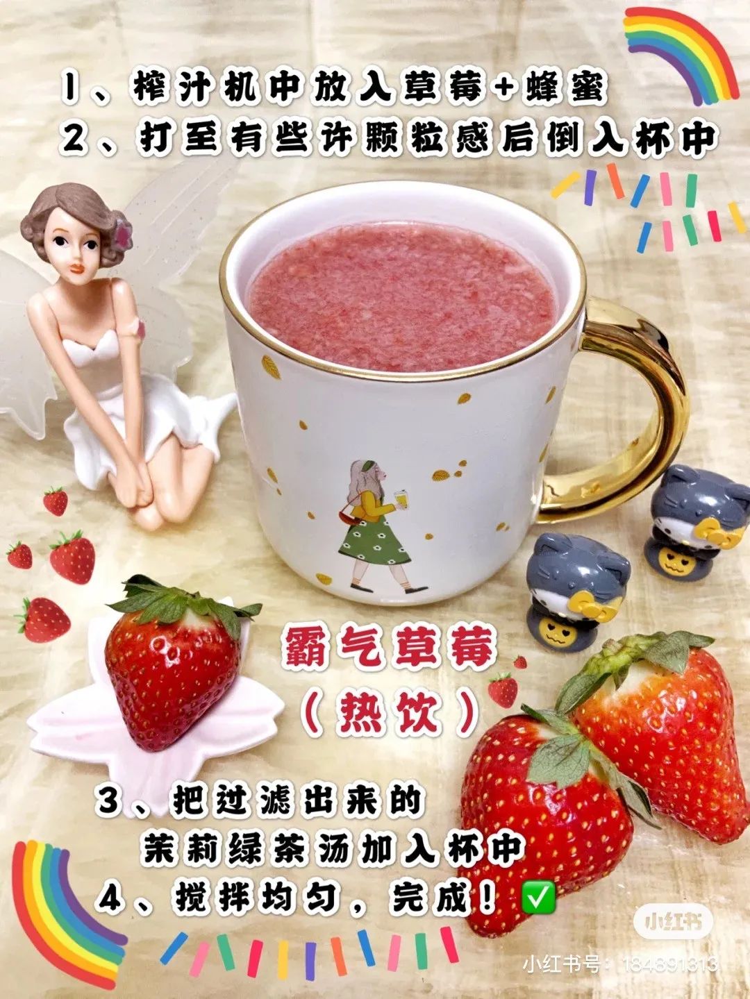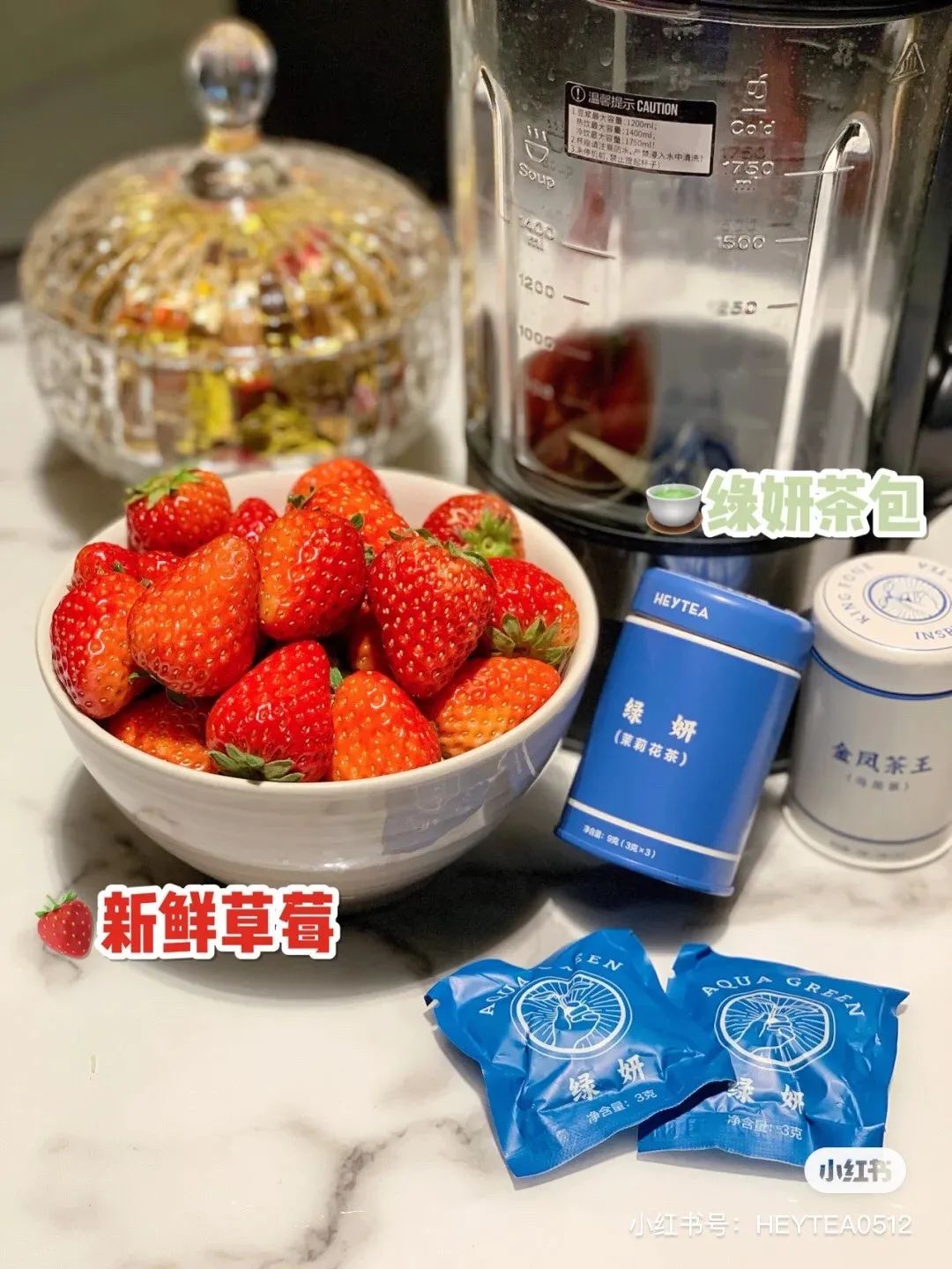 草莓 15颗(10颗打果茶,5颗作果肉铺底)、绿妍茶包—绿妍茶500ml、蜂蜜/白糖、冰块