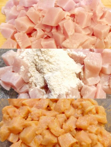 1.鸡胸肉切小块,放入腌料抓匀腌制十分钟以上。腌肉的调料我是在外面买的炸鸡调料,家里没有的话用盐、黑胡椒、酱油腌一下味道就很好了~