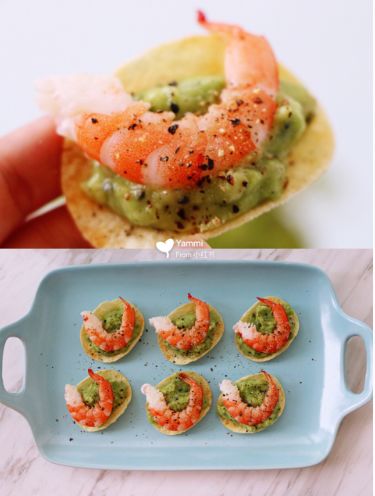 3.把牛油果浆放在薯片上,然后放上虾仁,撒上黑胡椒粉就可以开吃啦!