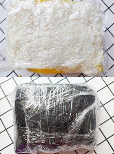 6.把保鲜膜和饭团整个从盒子中取出来,轻轻的把保鲜膜打开,包上紫菜,大概需要两片,再用保鲜膜包好。