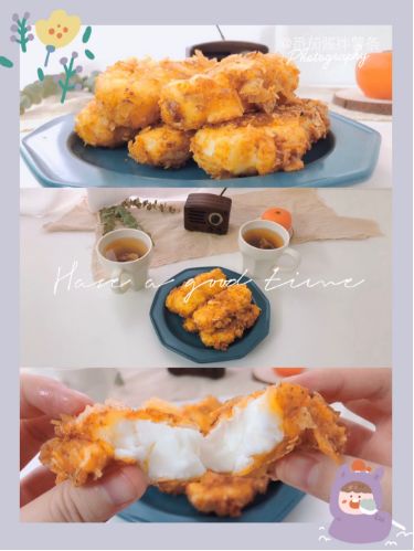 3.起锅热油,加热至六~七成热,筷子插进去起泡泡,就可以将裹好的奶糕放进油锅,炸至金黄即可出锅。