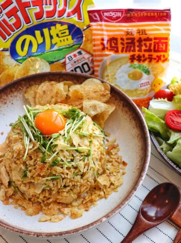 6.拿出海盐薯片,捏碎加入炒饭中,翻炒一下,出锅装盘,放上蛋黄。