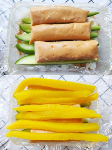 5.放一层黄瓜条,放一层鸡肉肠,放一层萝卜条,最后放1/3的米饭,把保鲜膜包好,按压实,这样吃的时候不容易散开。