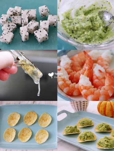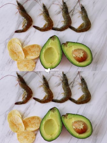 牛油果半只、火龙果少许(分量是牛油果的一半)、鲜虾几只、薯片同虾数量(品客薯片)