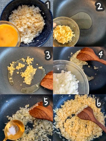 4.倒入裹上蛋液的米饭,炒至表面金黄出香气。