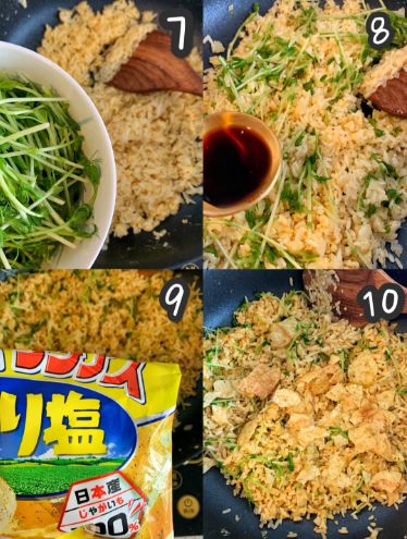 隔夜饭两碗、豌豆苗、白洋葱半个、蒜少许、蛋两个、海盐薯片一包、盐、胡椒粉、酱油、黑胡椒碎