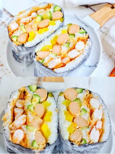 7.从中间切开就可以开吃了,巨无霸的大饭团,吃起来简直太过瘾了。