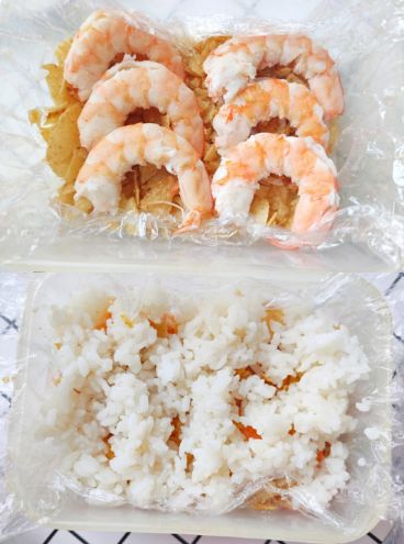 1.米饭中加入少许寿司醋,用铲子搅拌均匀,薯片随意选择自己喜欢的品牌和口味,打开包装之前,用手捏碎,再倒入盘子中,虾放开水中煮一下,虾变红色基本就可以捞出来了,黄瓜切条。