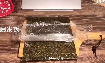 6.把保鲜膜和饭团整个从盒子中取出来,轻轻的把保鲜膜打开,包上紫菜,大概需要两片,再用保鲜膜包好。