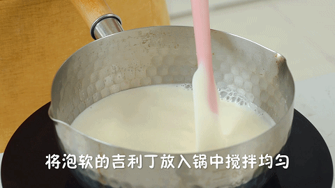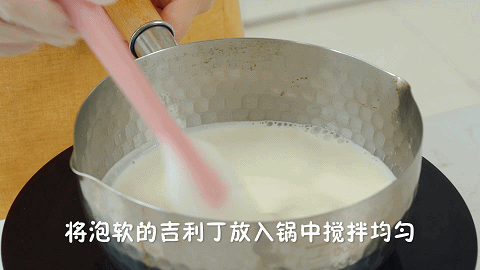 4、接着将泡软的吉利丁片放入锅中搅拌均匀,椰浆混合液就做好了