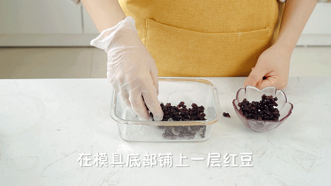 5、然后在模具底部铺上一层蜜红豆