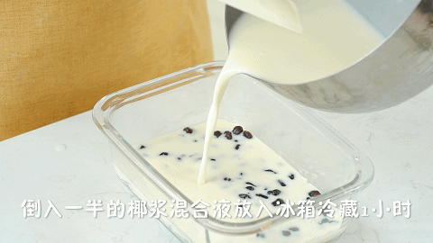 6、再倒入一半步骤4做好的椰浆混合液,放入冰箱冷藏1小时备用