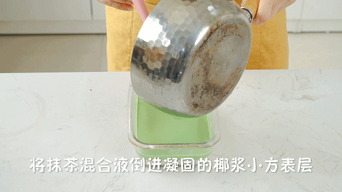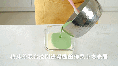 8、将抹茶混合液倒入凝固好的椰浆小方表层