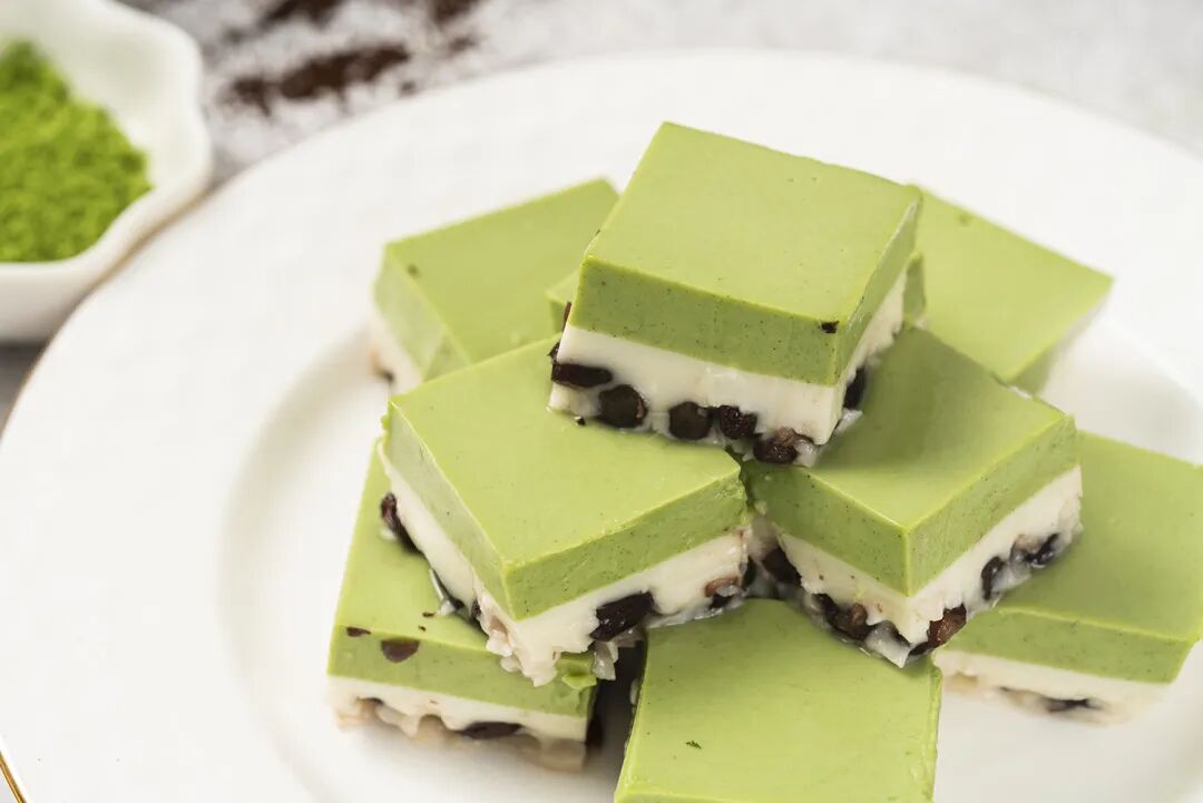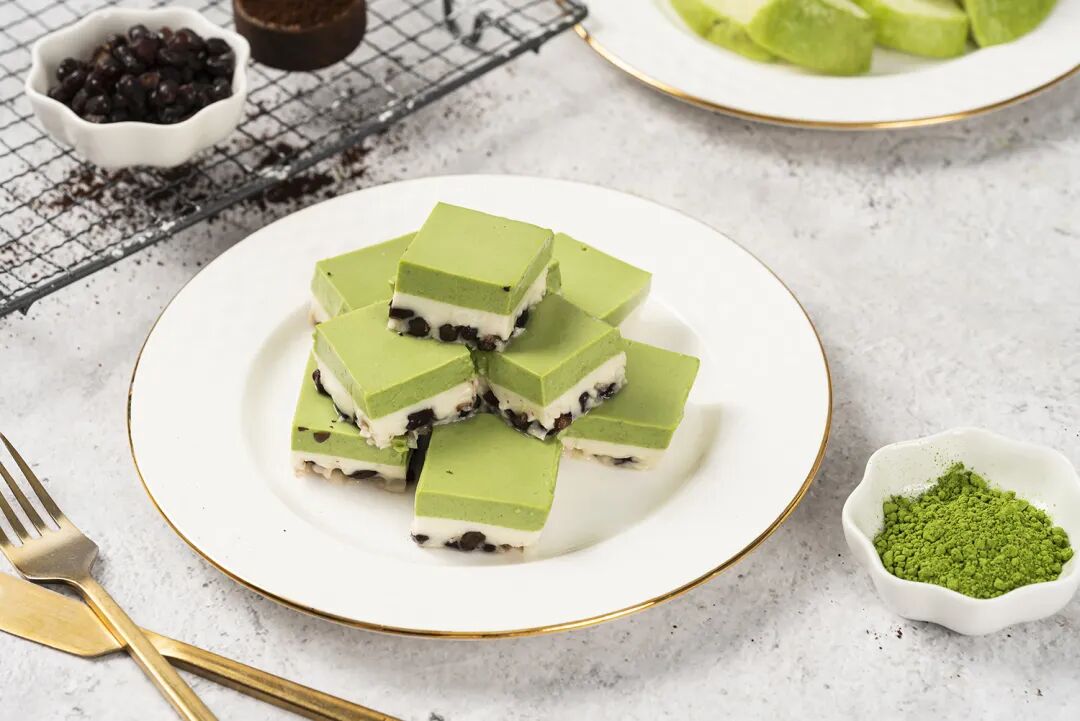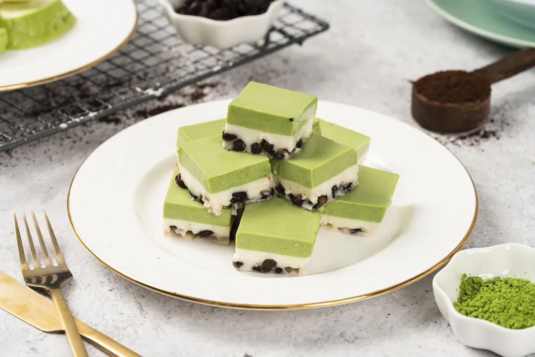 拿起一块,入口香滑细腻,浓郁的椰浆和红豆的香绵清甜中,又糅合了抹茶的微苦,一点腻的感觉也没有,吃完还有些回味。
