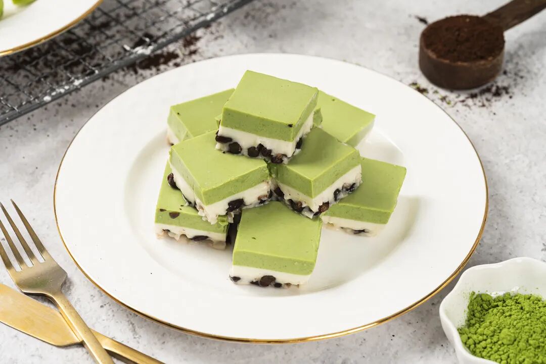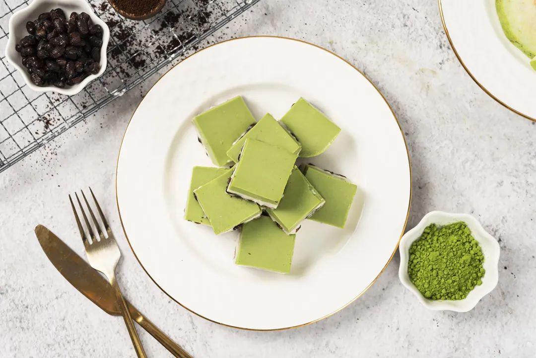 取出凝固好的抹茶蜜豆小方,切成小块就可以吃啦!