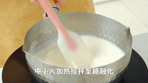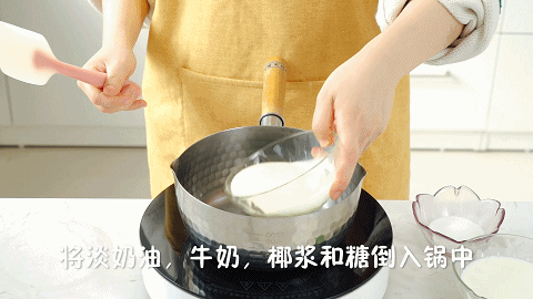 3、将100克淡奶油、140克牛奶、60克椰浆和30克细砂糖倒入锅中,用中小火加热至融化