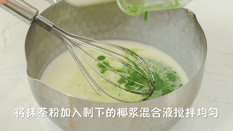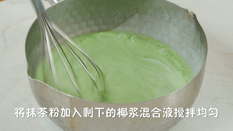 7、将2克抹茶粉加入剩下的椰浆混合液,并搅拌均匀,这一步如果有颗粒的话,需要过筛