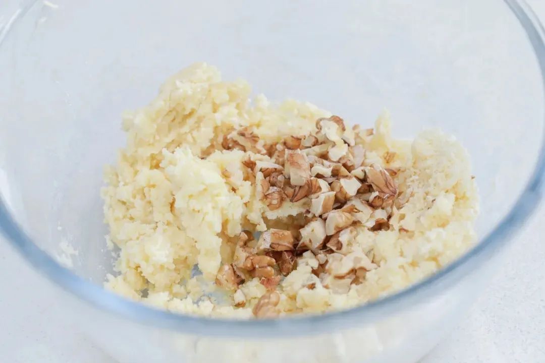 核桃碎可以增加雪球酥的口感层次,虽然不放也能做,但肯定没那么好吃。如果没有核桃碎,也可以换成巴旦木、榛子、花生碎等。