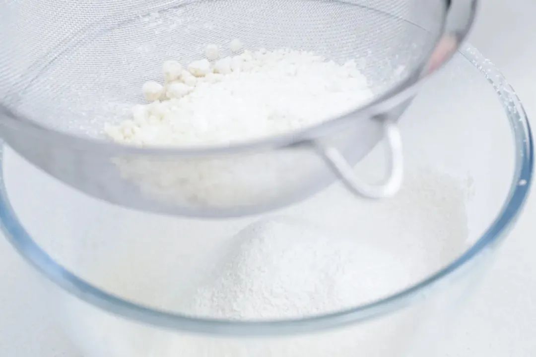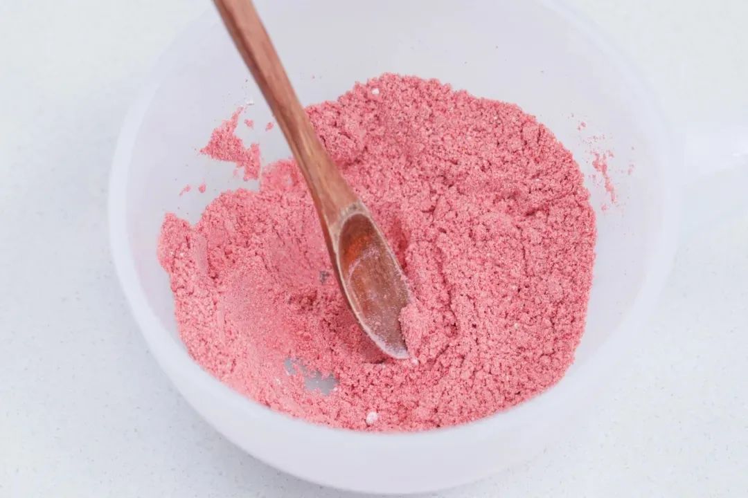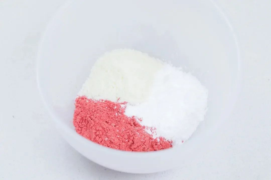 9、这时候我们来准备一下裹粉,15g糖粉、15g奶粉加15g冻干草莓粉。