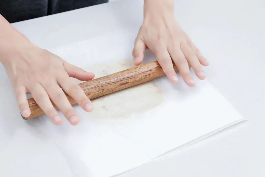 12、取出饼干面团,上下夹油纸,用擀面杖撑开,厚度约1.5厘米。