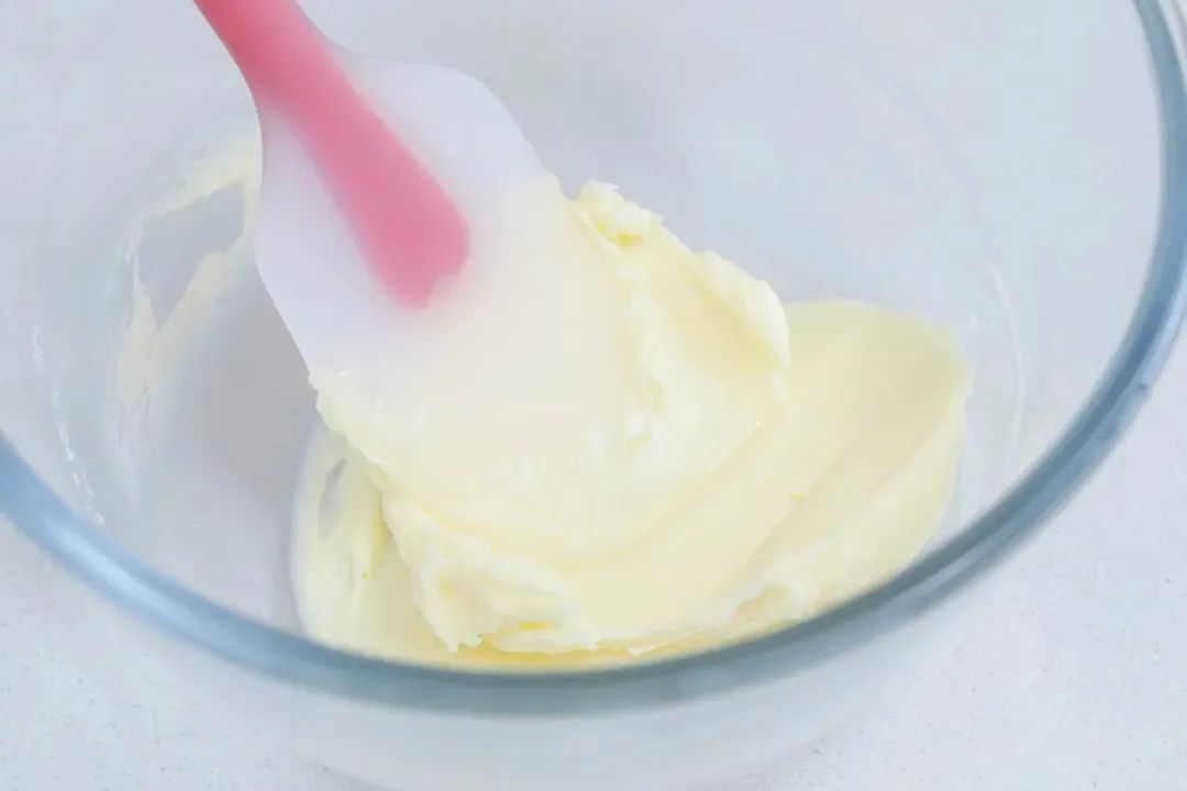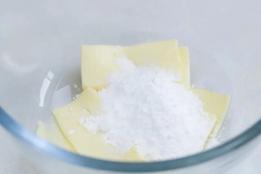 1、将50g黄油切片室温软化至可以轻松戳穿的程度,加入15g糖粉和1.5g盐。