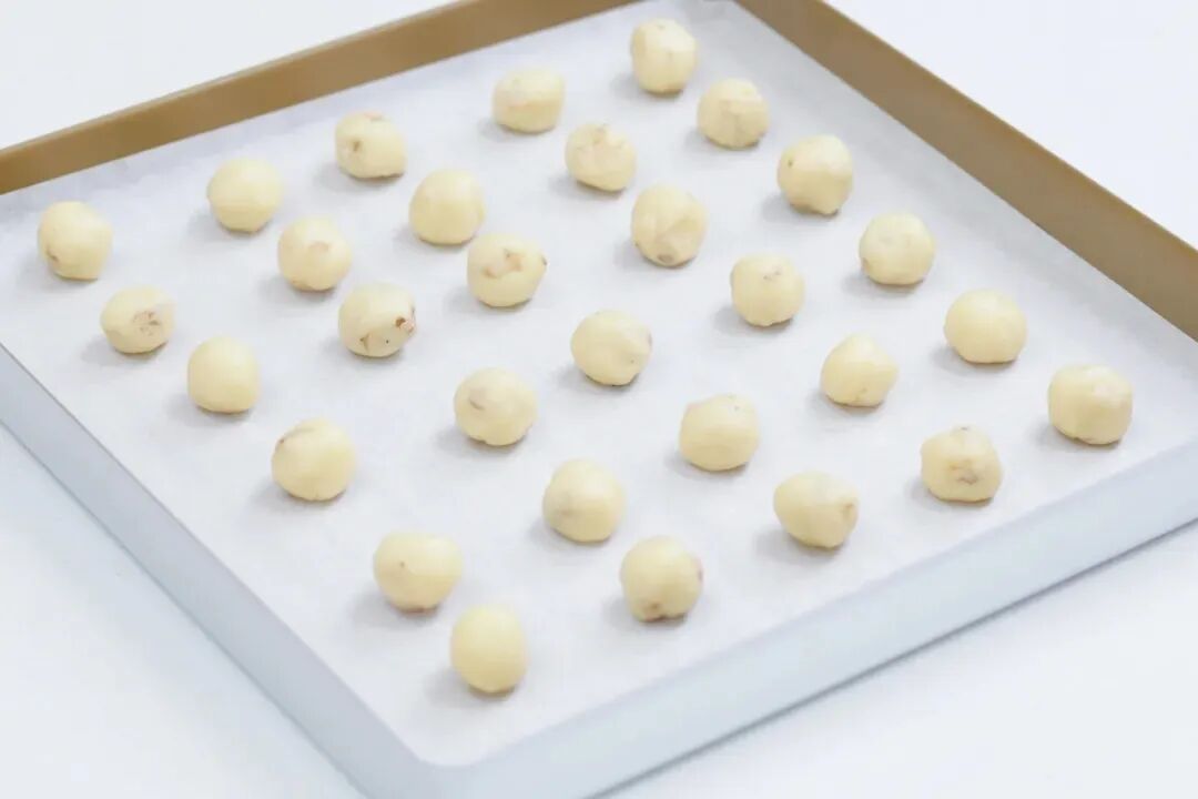14、将所有面团搓圆,保持1.5倍以上间隙,摆入垫了油纸的烤盘中。