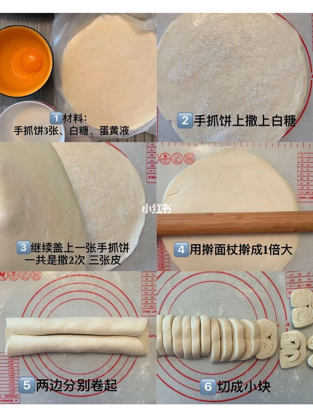 手抓饼3张、白糖、蛋黄液。