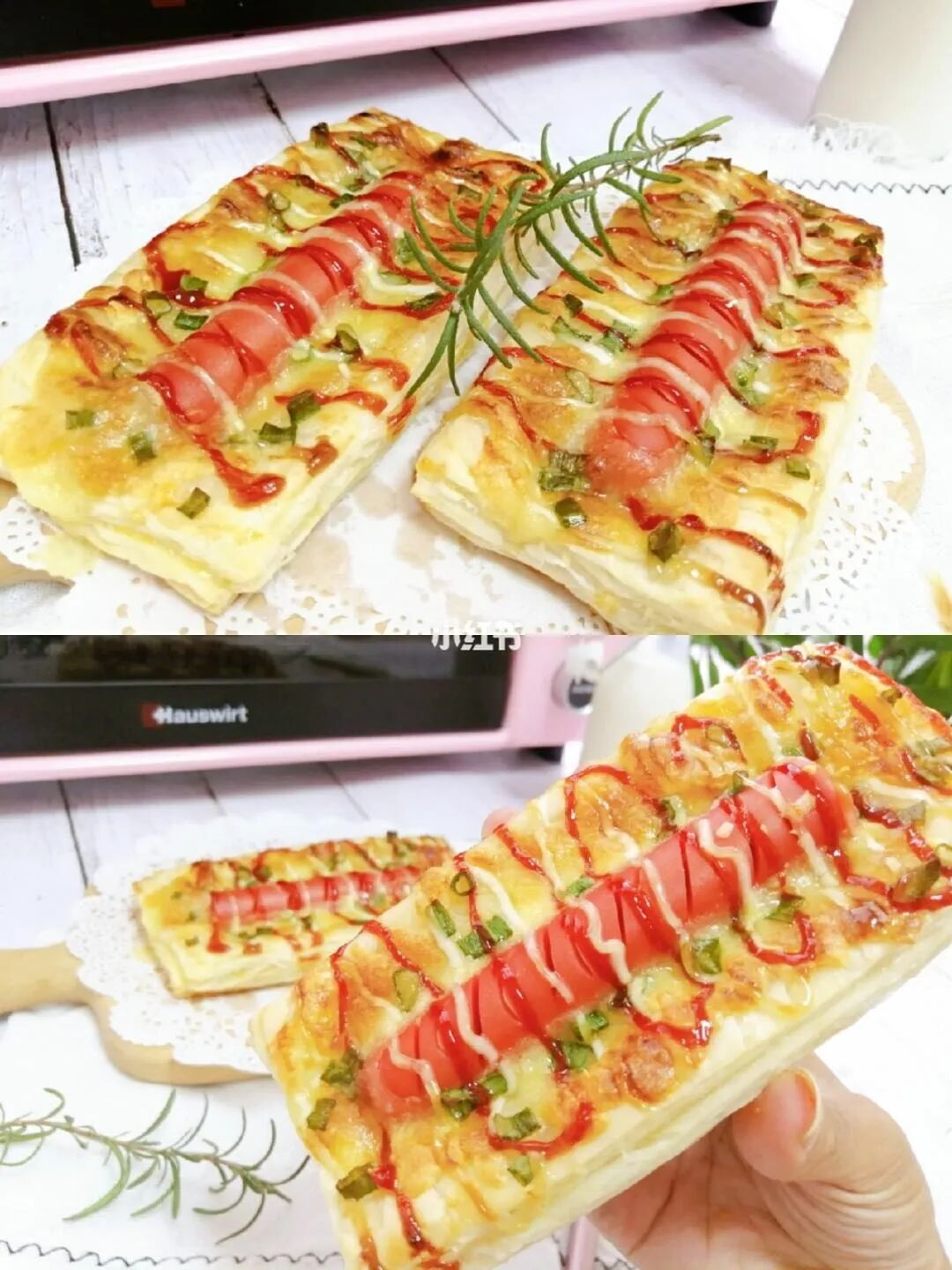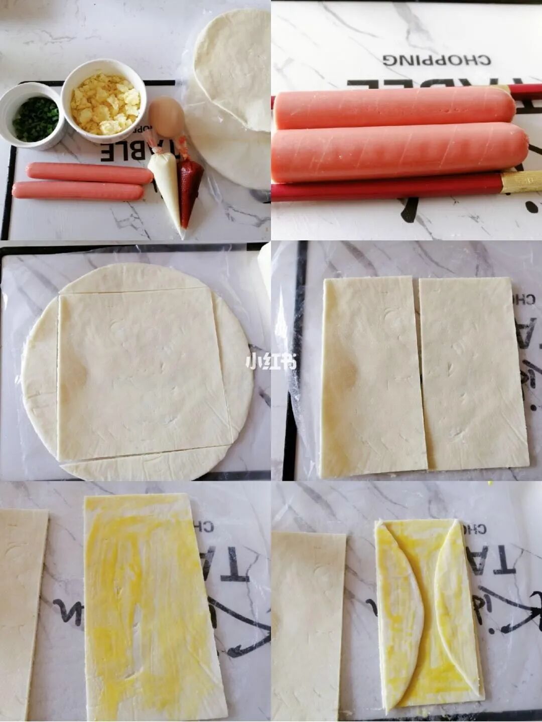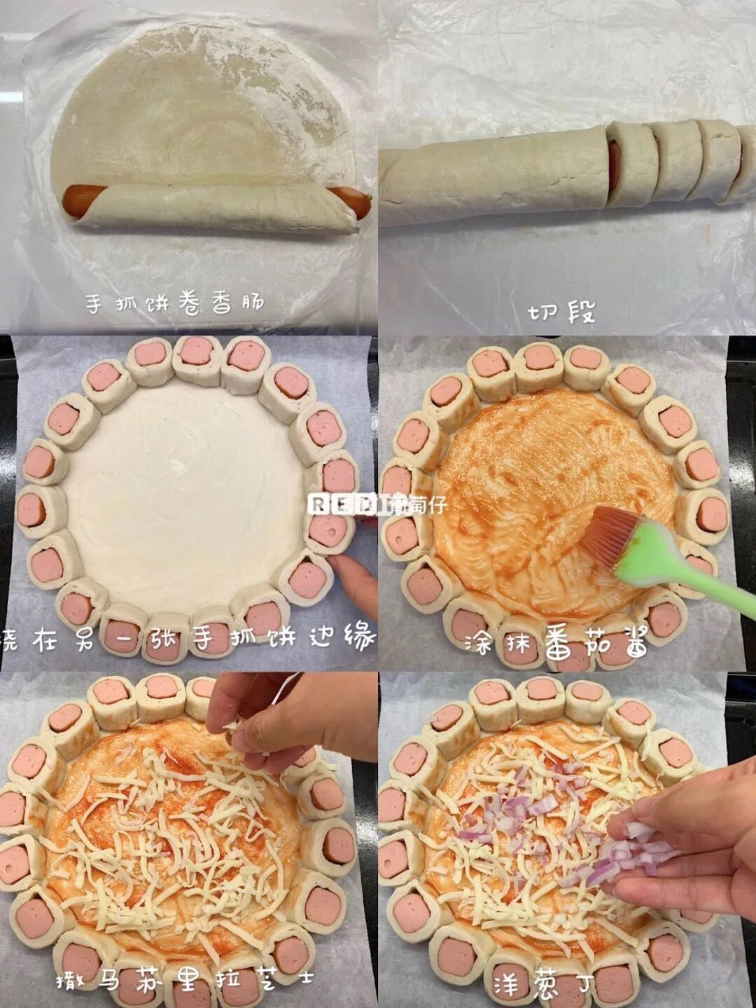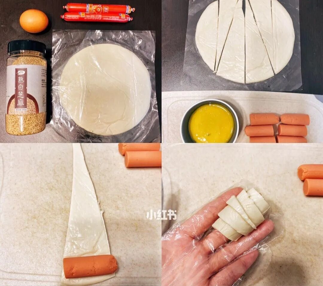 注意:手抓饼切成6份,搭配1/3的火腿肠正正好好,大了不好看,小了又太小。
