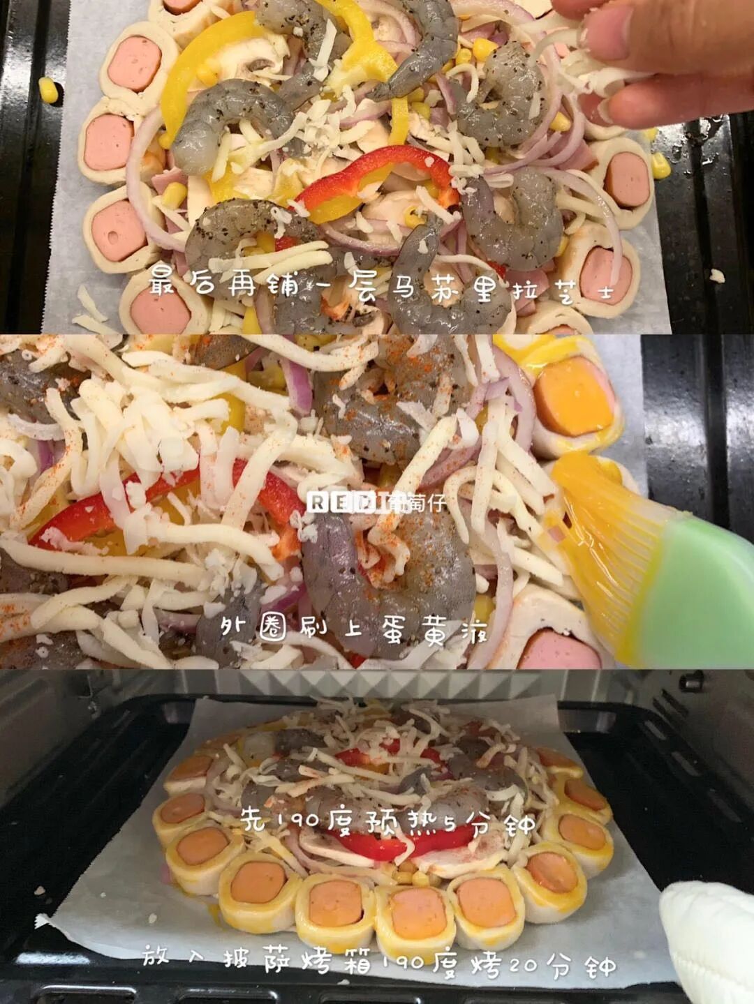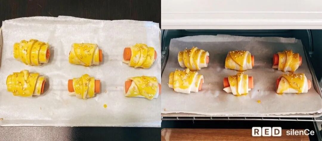 4.用蛋黄液涂抹外圈香肠卷(嫌麻烦可以省略噢)送入190度预热5分钟的烤箱,上下火190度烤20分钟就完成啦~