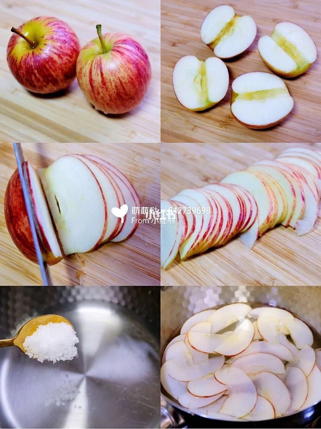 1.苹果用盐把表面残留洗净,对半切开,挖净果核。用锋利的刀把苹果切成薄片,一定要很薄哦。